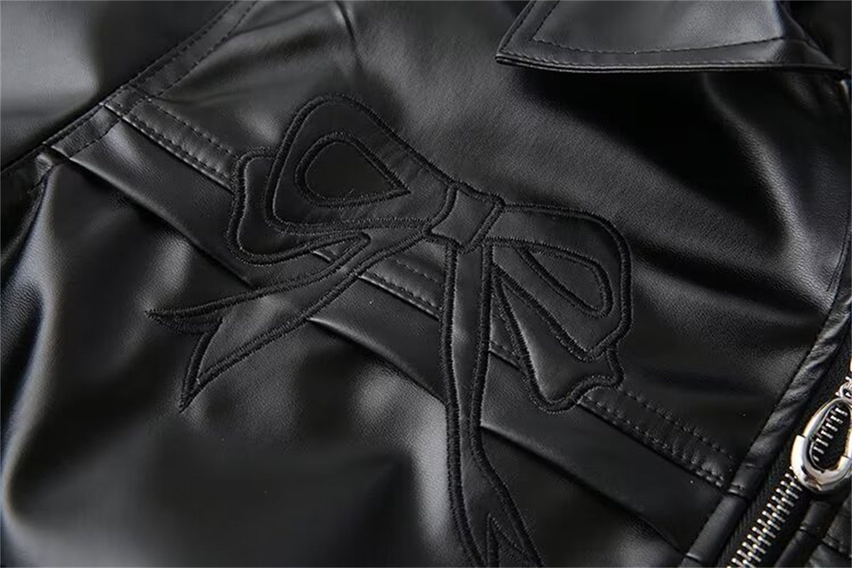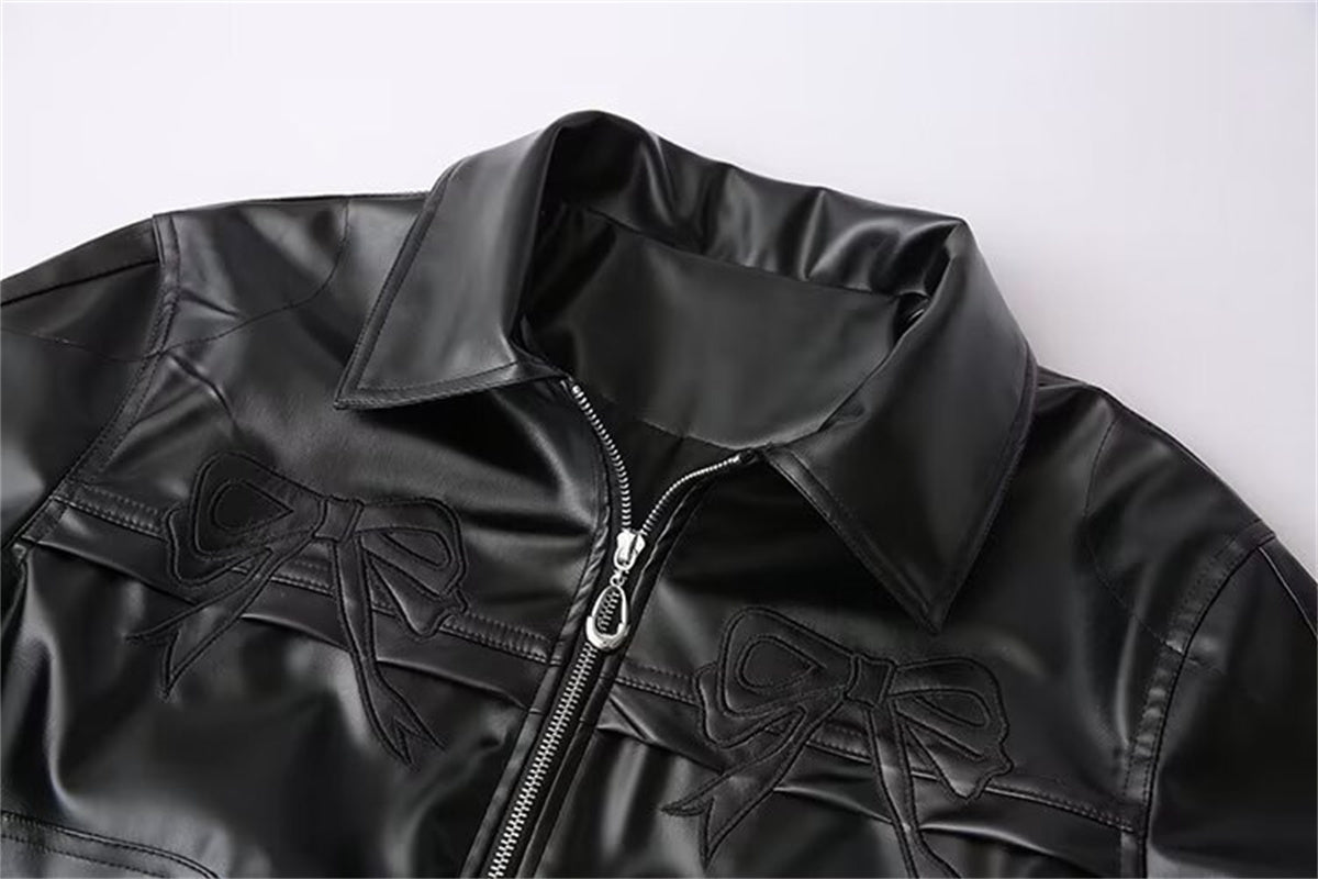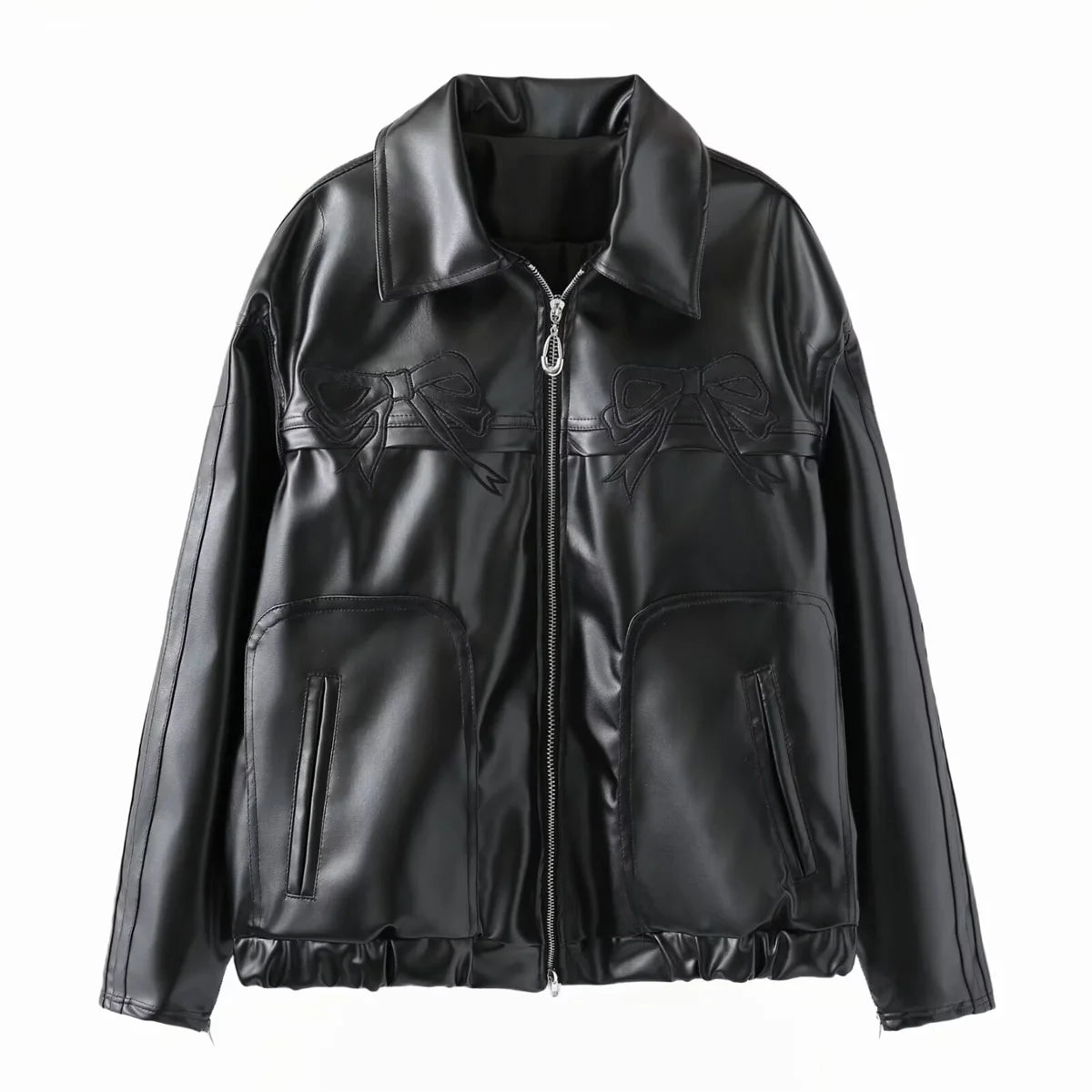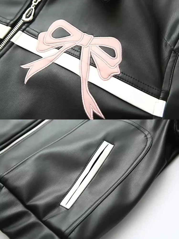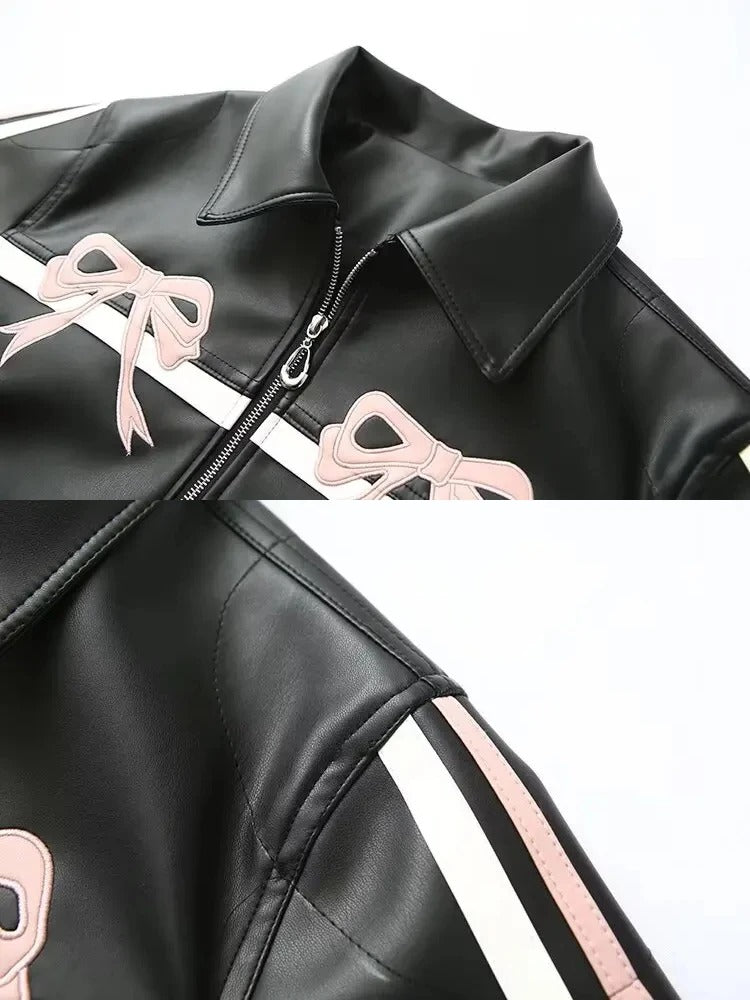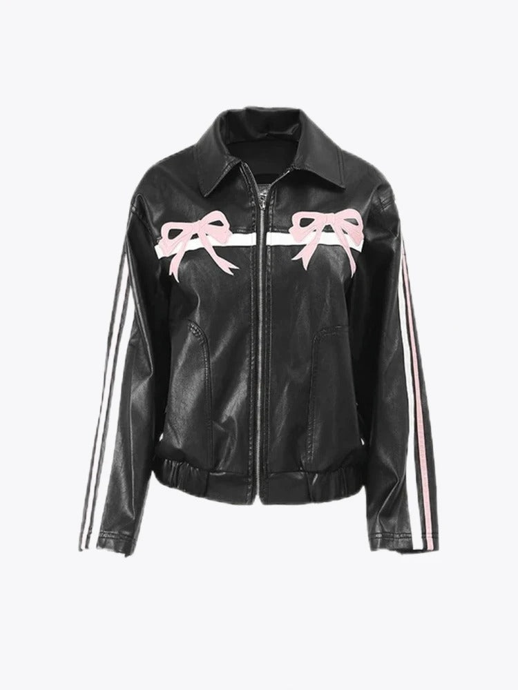 Stay effortlessly chic with Bowbelle, a vintage-inspired PU leather jacket featuring Harajuku-style charm. Adorned with soft pink bows, bold contrasting stripes, and a classic lapel collar, this casual yet trendy piece is perfect for the Autumn/Winter season. Its relaxed fit and durable zipper closure make it an essential streetwear staple for Y2K fashion enthusiasts. Perfect for layering, Bowbelle combines edgy aesthetics with a sweet, feminine touch to elevate your wardrobe.
