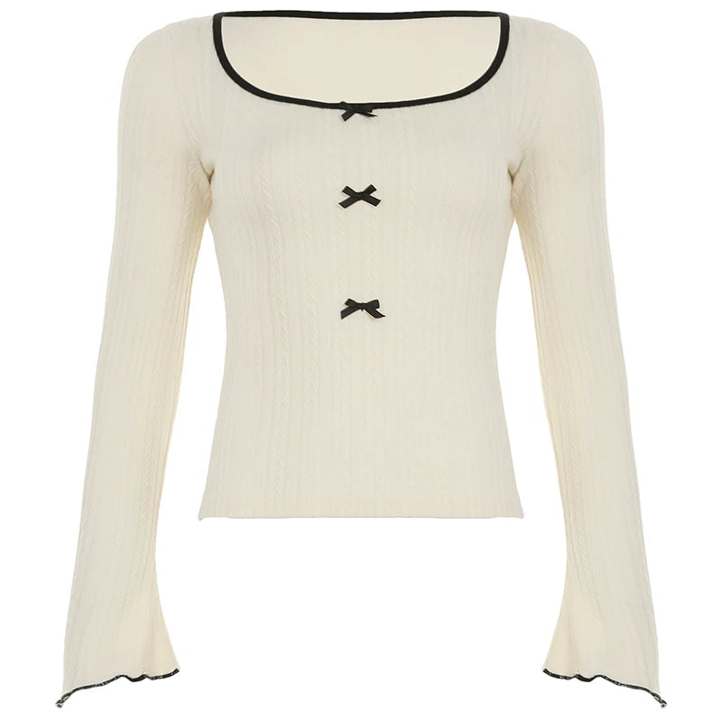 This elegant BowKnit top blends cozy knitwear with delicate bow accents for a charming, feminine touch. Designed with a square neckline, flare sleeves, and contrast trim, it creates a vintage-inspired Y2K aesthetic. The soft, stretchy fabric ensures a comfortable fit, making it perfect for autumn and winter layering. Whether paired with a frilly skirt or high-waisted jeans, this top adds a sweet yet sophisticated flair to any outfit.