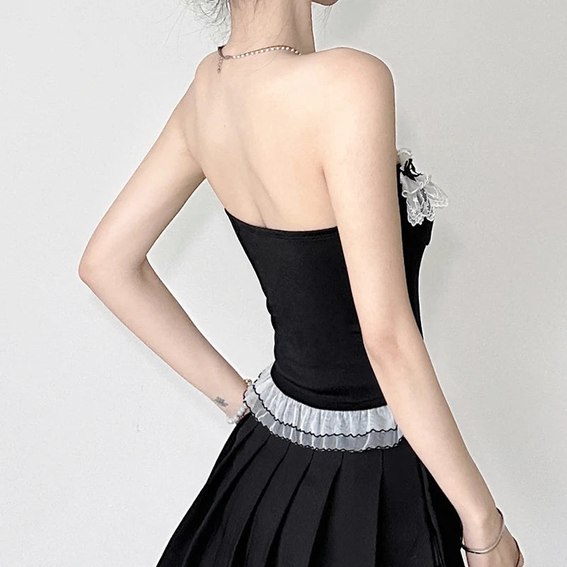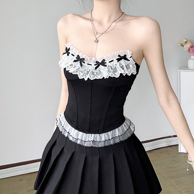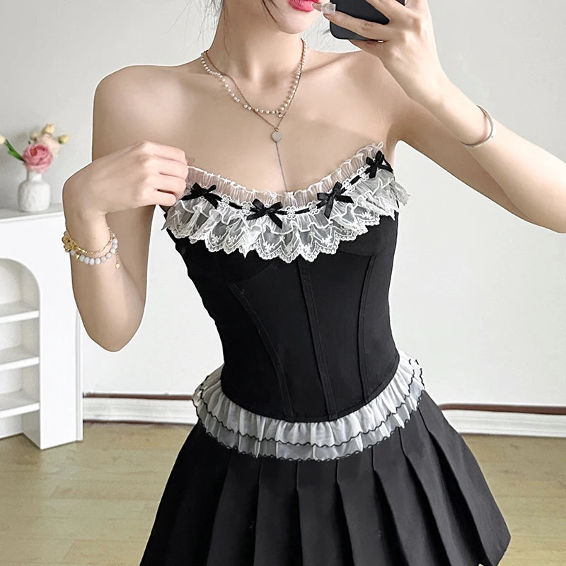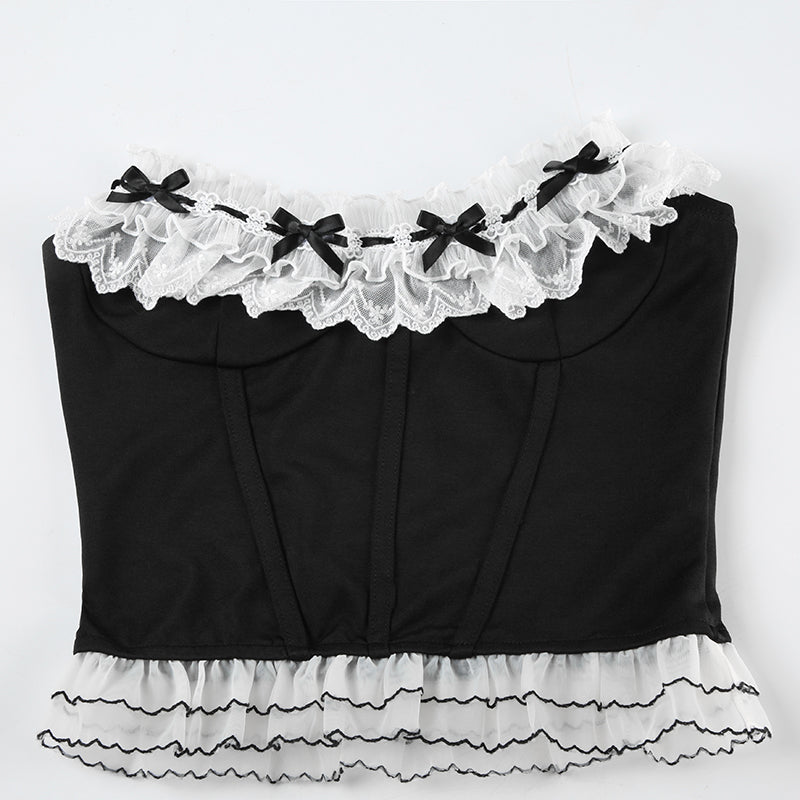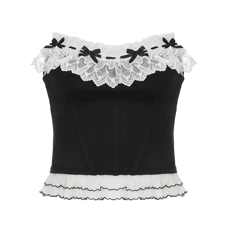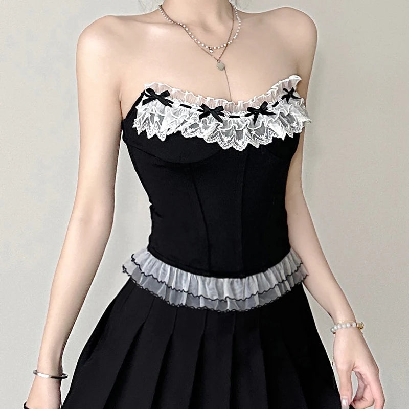 Elevate your coquette aesthetic with the Celestine tube top—a stunning blend of delicate lace patchwork and a sleek, figure-hugging fit. Designed with a strapless silhouette, this Y2K-inspired corset-style crop top is perfect for adding a touch of vintage romance to your wardrobe. Crafted from a soft polyester blend, it offers slight stretch for a comfortable yet structured feel. Featuring an elegant bow detail, contrast lace trim, and a broadcloth base, this top is your go-to for date nights, holiday parties, or effortlessly chic streetwear looks.