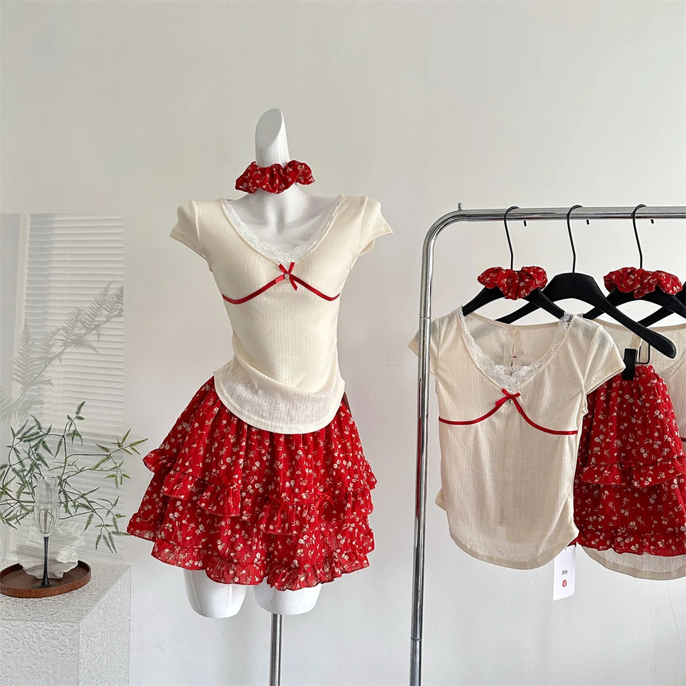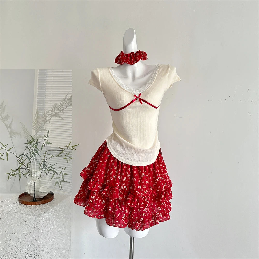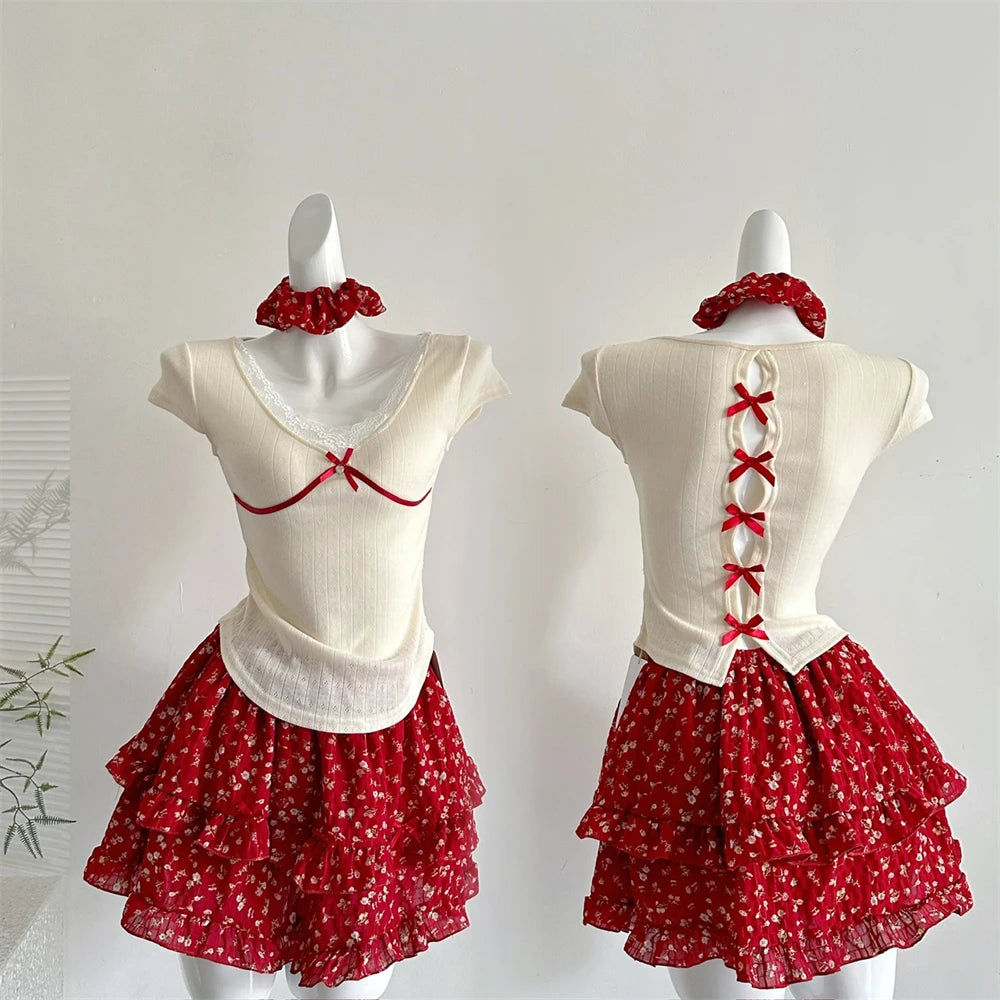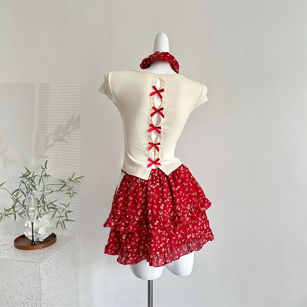 Cherryette is a sweet, summery 2-piece set perfect for day dates, night outs, or graduation season. Featuring a soft lace-trimmed top with cherry-red ribbon details and a flouncy layered mini skirt, this look blends balletcore charm with coquette flair. Made from breathable silk cotton with a flattering slim fit and elastic waist, it’s all about playful femininity and comfort.