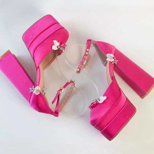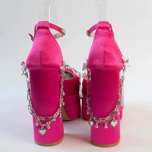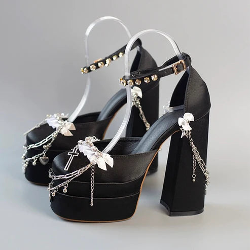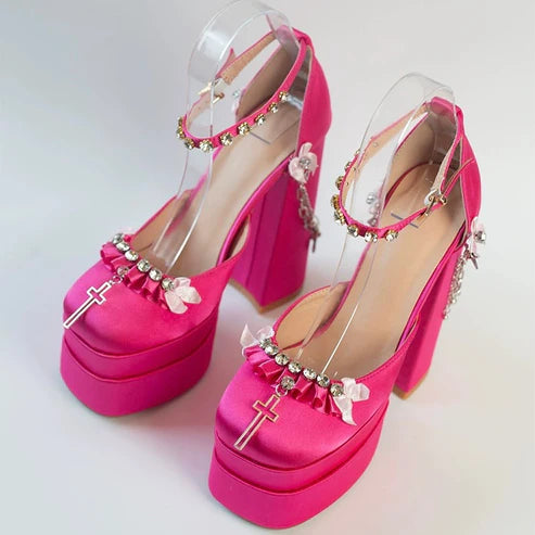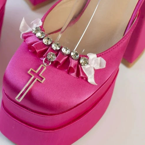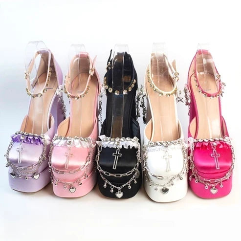 Elevate your style with Cherubina, the ultimate statement heels inspired by Japanese Sweet Lolita fashion and Y2K aesthetics. Featuring 15cm thick platform heels, luxurious pink satin finish, delicate heart chains, and cross embellishments, these handmade shoes blend gothic elegance with heavenly charm. Perfect for pairing with dreamy dresses, these iconic high heels are designed to make every step angelic and unforgettable.