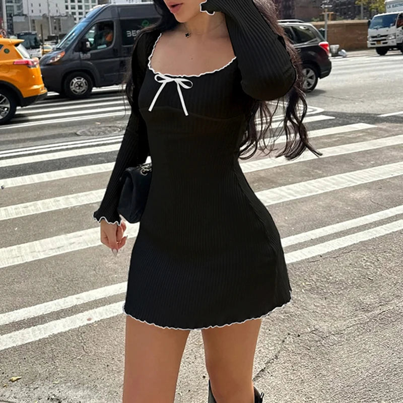 Elevate your wardrobe with the Dahlia Dress, a charming blend of elegance and coquette aesthetics. Designed for those who love a touch of vintage romance, this dress features a flattering square neckline, delicate bow detailing, and a slim-fit bodice that gracefully flares into an A-line silhouette. The long sleeves add a refined touch, making it perfect for all seasons.