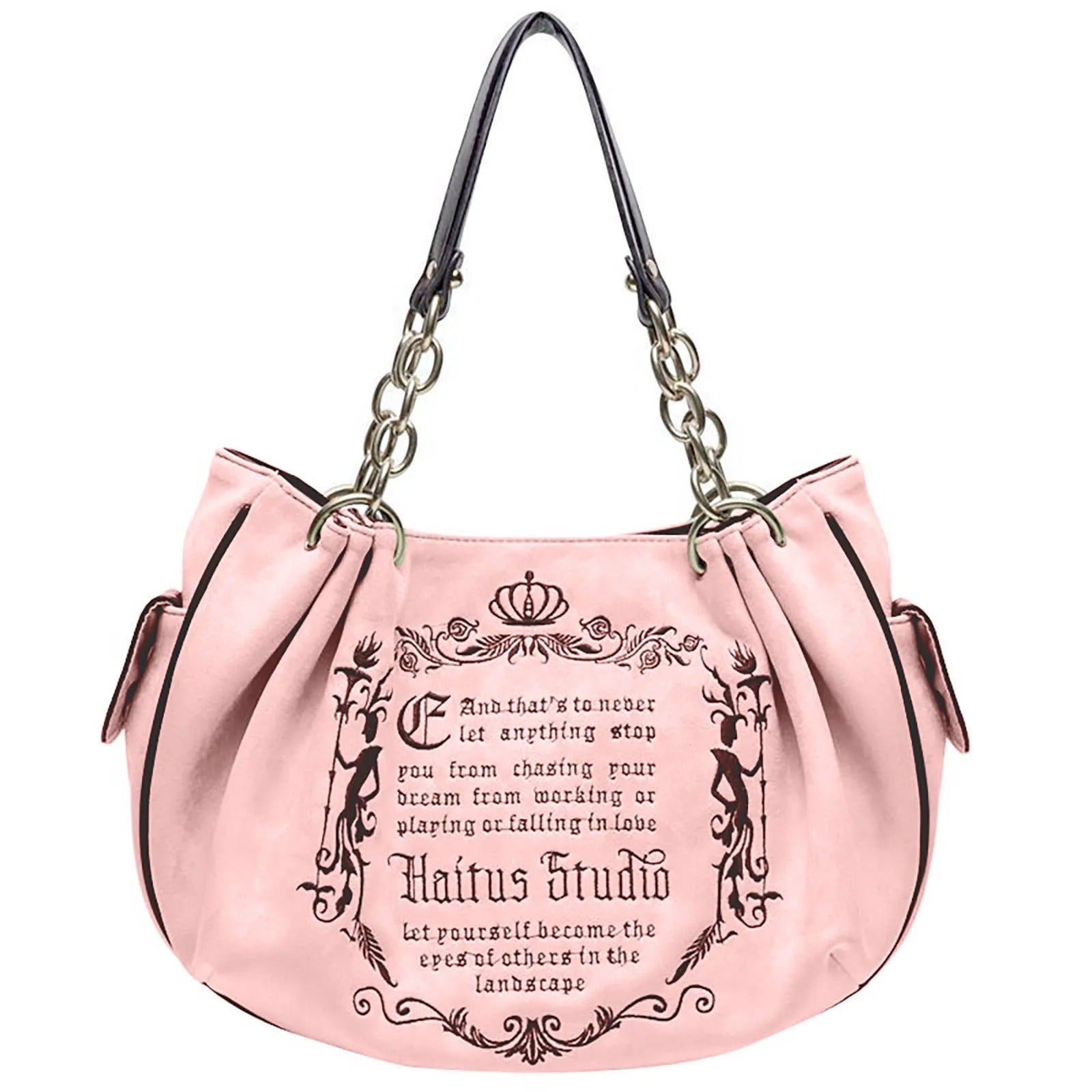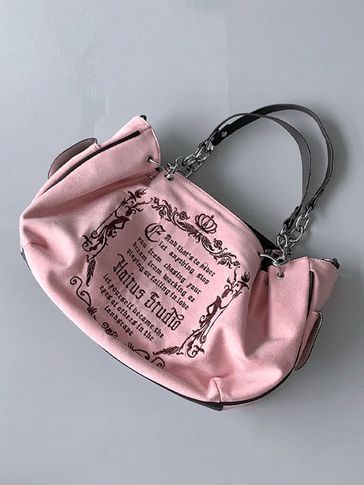 This blush-pink shoulder bag features elegant gothic lettering, delicate crown details, and silver chain handles that sparkle with every move.