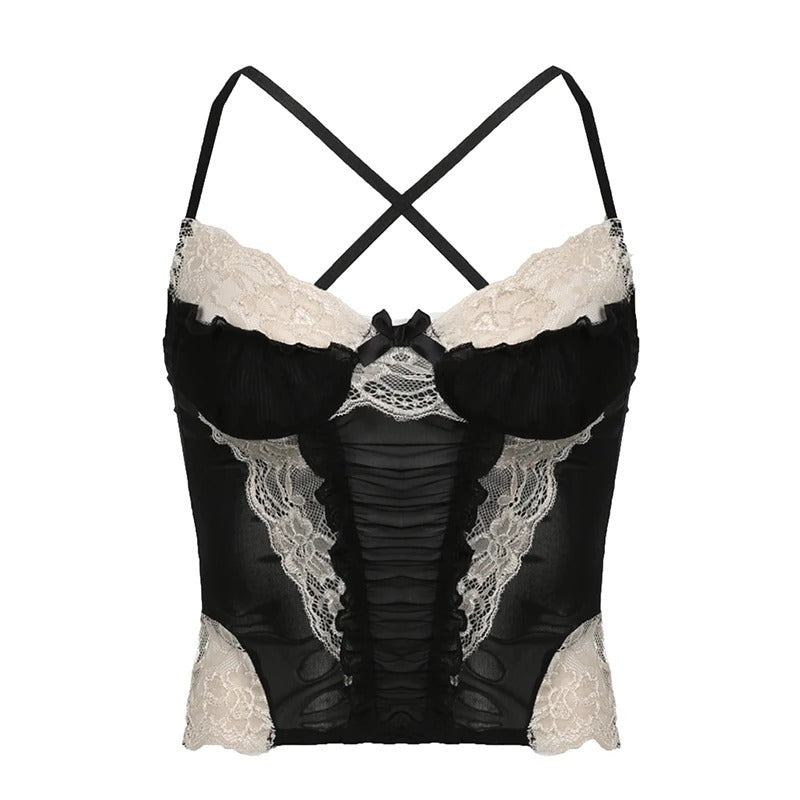 Flirty, feminine, and effortlessly chic—Lacerella is the ultimate blend of vintage romance and Y2K glam. With delicate lace splicing, soft ruffle details, and a dainty bow, this dreamy crop top adds the perfect touch of elegance to your look. The semi-sheer mesh and figure-hugging stretch fabric make it both sultry and comfortable, ideal for summer days and nights.