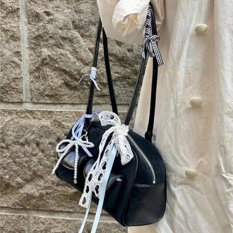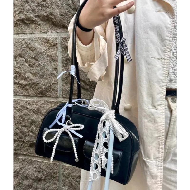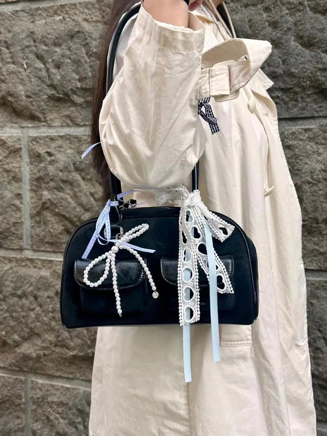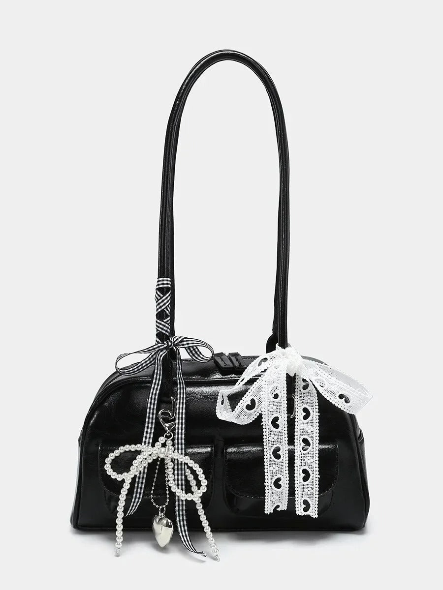 Decorated with pearl bows, lace ribbons, and a classic black finish, it’s the perfect balance of soft girl meets dark romance.