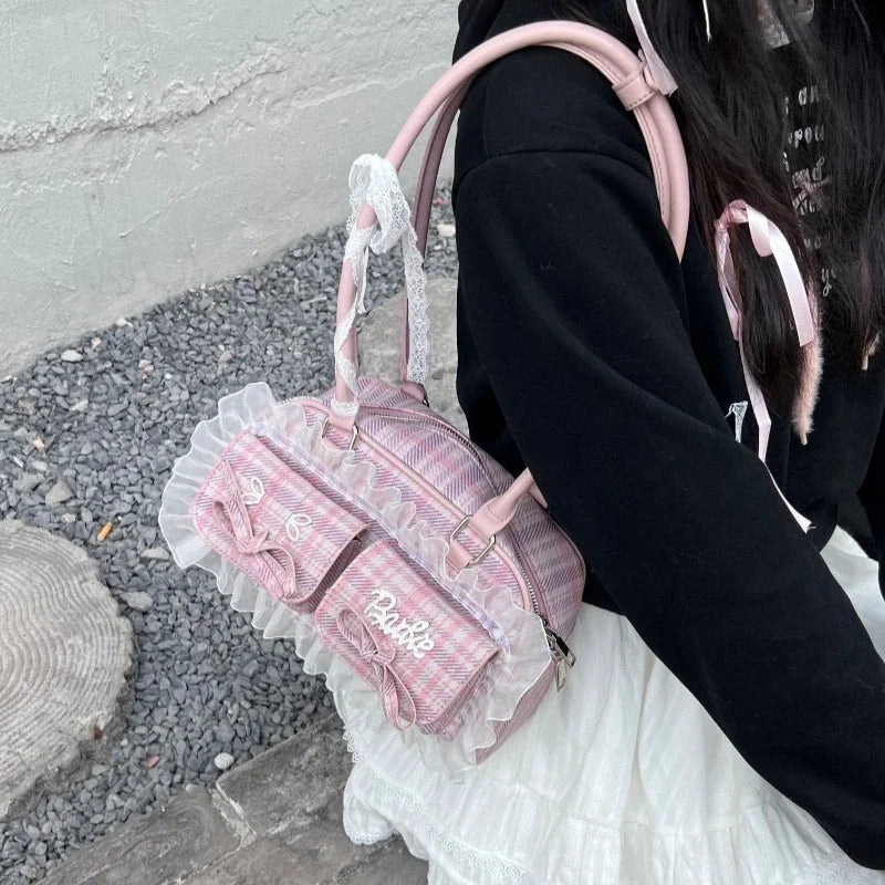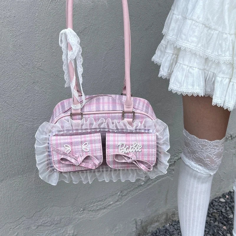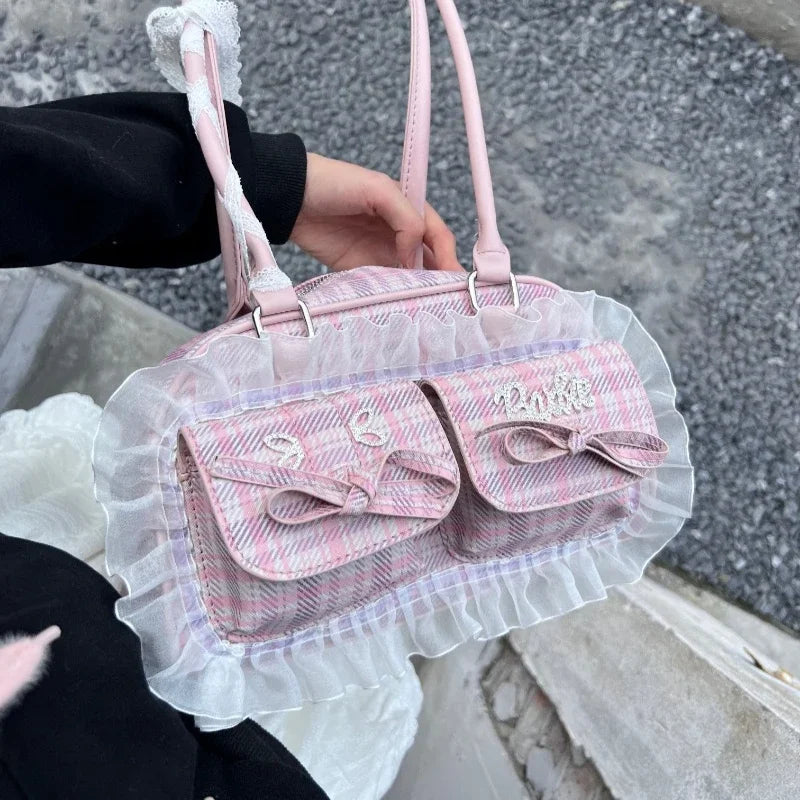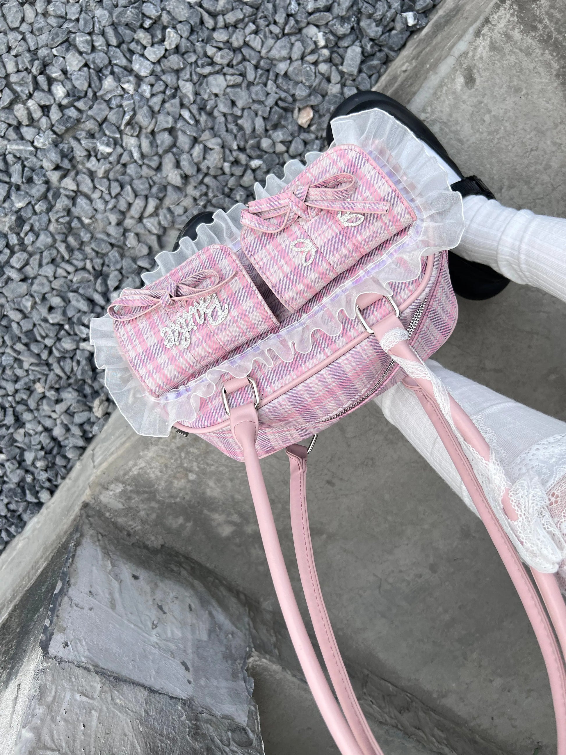 The Ruffelle Shoulder Bag blends feminine elegance with modern functionality. Designed with a soft PU leather exterior and charming plaid pattern, it features delicate lace detailing that adds a touch of sophistication.