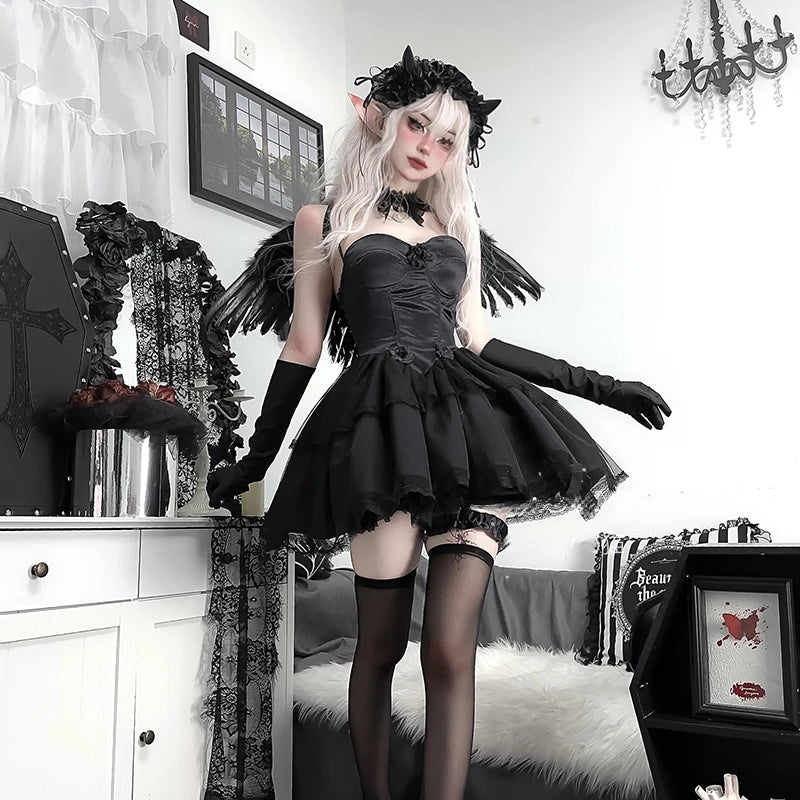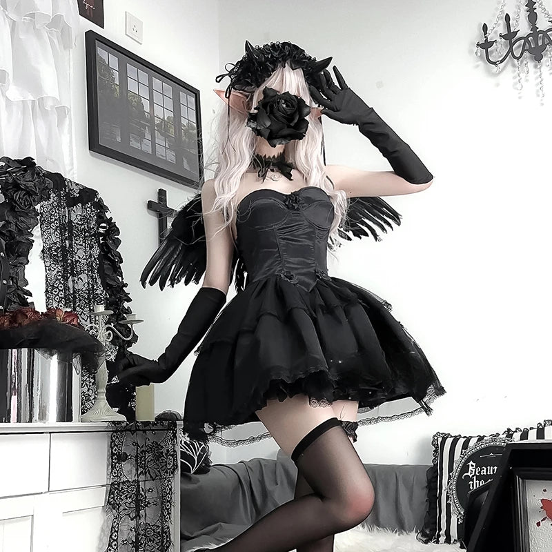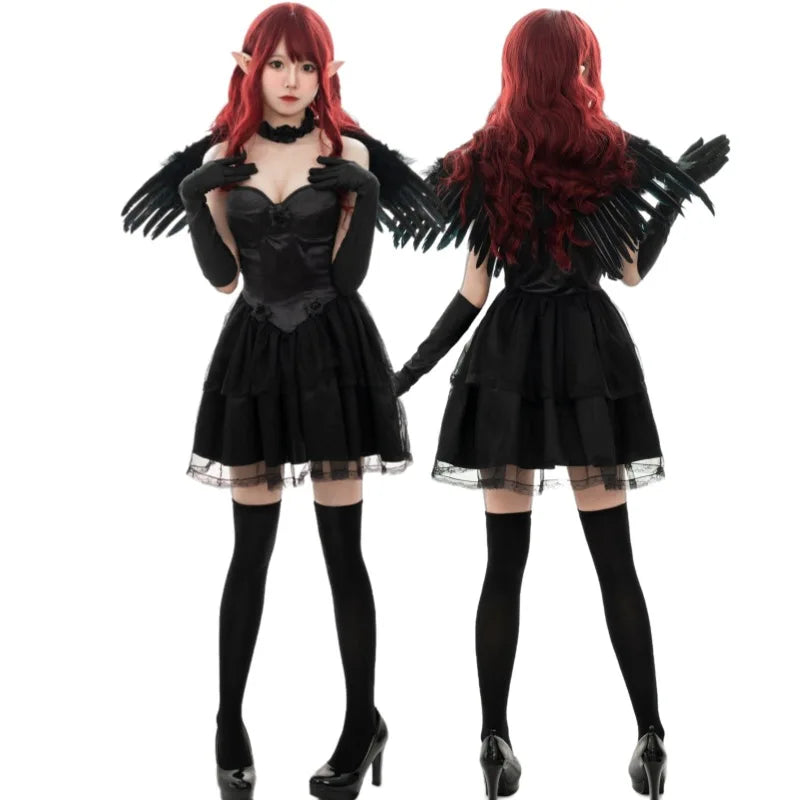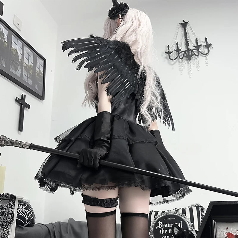 Step into the shadows with the Midnight cosplay set from KawaiiffyMe. This stunning gothic Lolita ensemble features a dramatic black dress, ethereal wings, elegant gloves, and a statement necklace, perfect for Halloween or anime-inspired role play. Crafted from high-quality polyester, this dark angel look is ideal for fans of punk, Japanese anime, or ghostly bridal aesthetics.