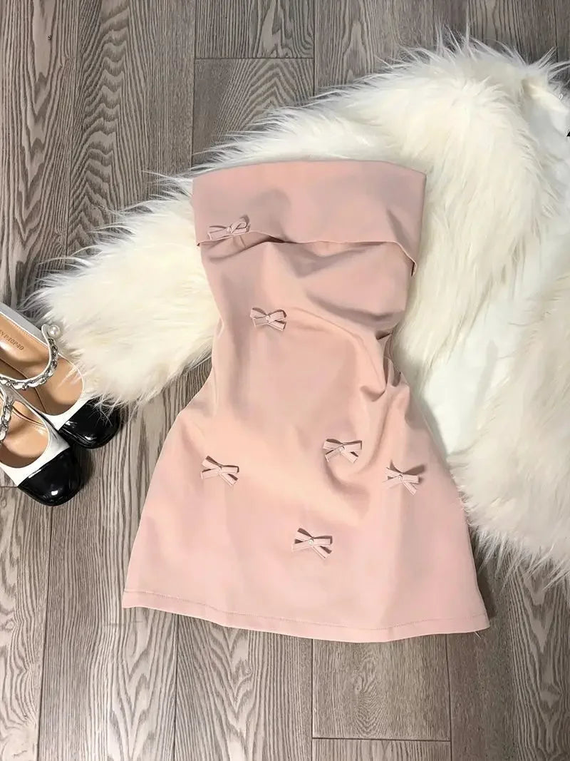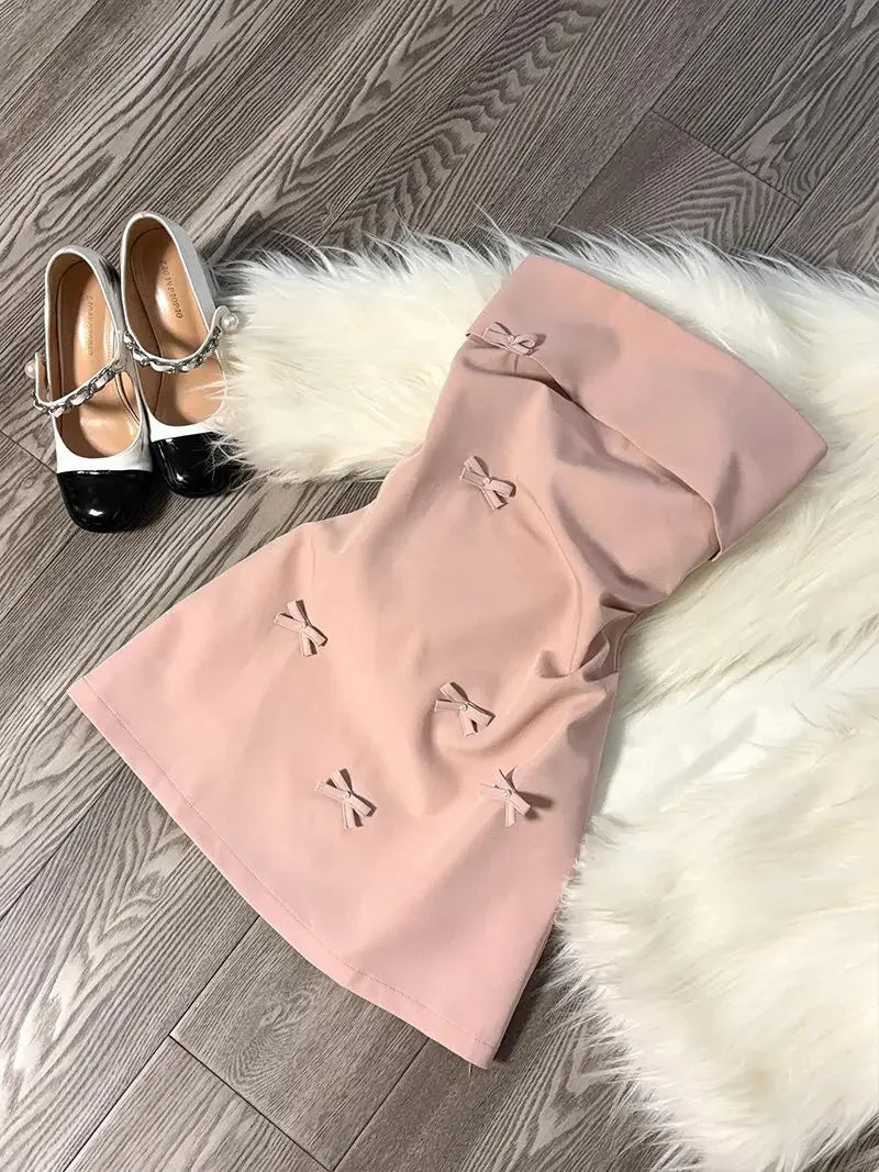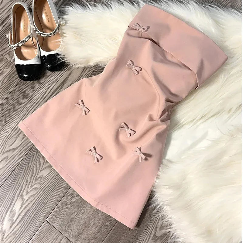 Embrace ethereal charm with Papillia, a Korean-inspired mini dress that flutters between dreamy and daring. Adorned with a delicate 3D bow detail and designed in a soft pink hue, this dress captures the essence of feminine allure. The strapless silhouette paired with unique princess-style sleeveless cuts creates a flattering frame, while the mini length adds a playful edge.