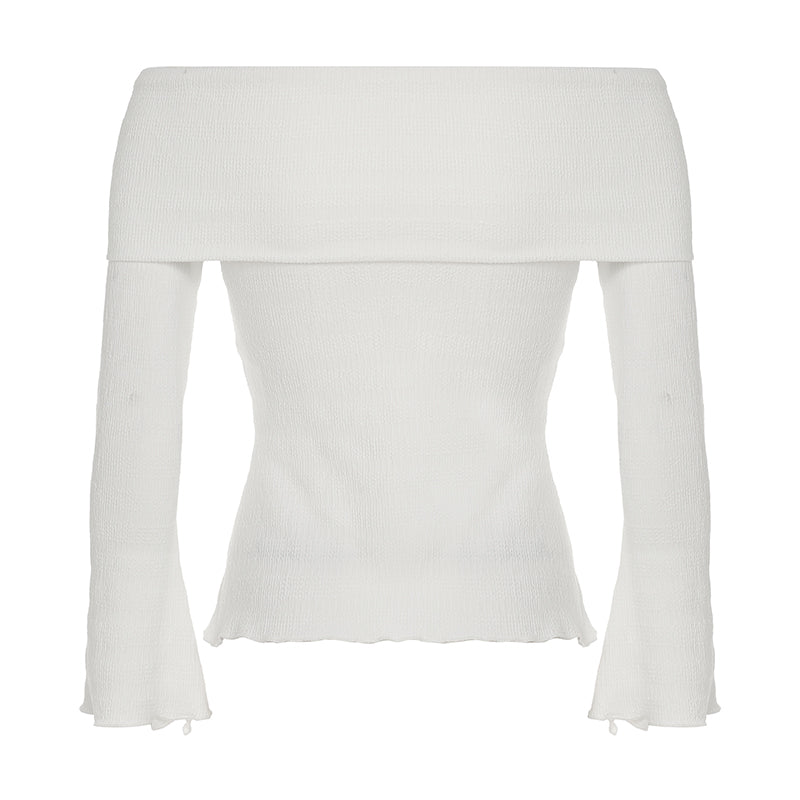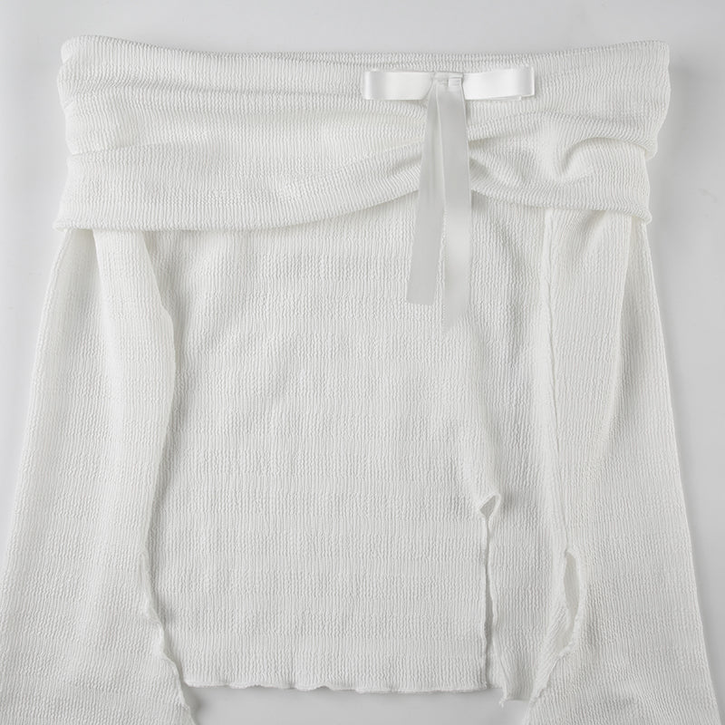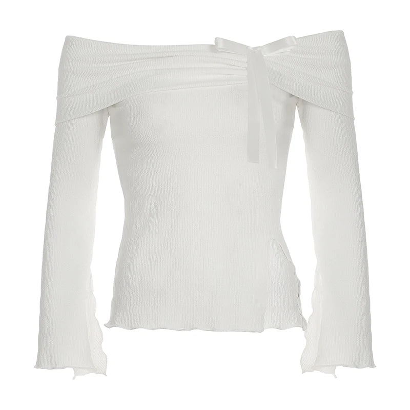 The slash neck design adds a touch of elegance, complemented by a delicate bow detail for a coquette-inspired charm. Full-length flared sleeves and a ruched split design enhance its stylish appeal, making it a versatile choice for casual outings or evening soirees. Available in a timeless solid white, the Twilene pairs effortlessly with high-waisted jeans, skirts, or tailored trousers.